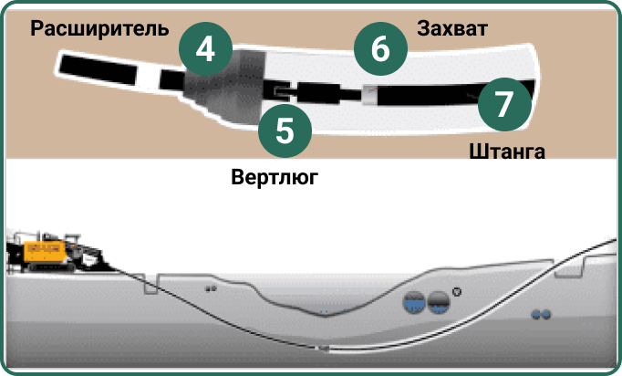 Буровые штанги забуриваются в грунт по проектной траектории до точки выхода. Контроль за положением головки осуществляет локаторщик с помощью системы локации с поверхности земли. После того как головка вышла в приемный котлован, она снимается, а на ее место устанавливается первый риммер-расширитель.
