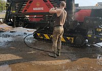 Поэтапно, извлекая штанги из скважины, протащить трубу в подготовленный буровой канал. Излишки бентонитовой смеси также откачиваются илососными машинами.